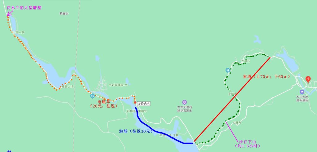 总结,最佳路线就是索道上天池,然后天池码头乘游船,再放弃电瓶车,步行到花 木兰 的大型雕塑处,也叫做忠孝园。然后在忠孝园放松休息,尽情的体会世外 桃源 一样的田园生活。之后,再步行回来,乘游船到天池码头,然后沿着绿色的虚线徒步下山,一路玩水,顺便走一走玻璃桥。这条路线的话,体力消耗最少,优美的风景一点都没错过,而且刚好一天时间,玩到了 木兰 天池中90%以上的景点。
