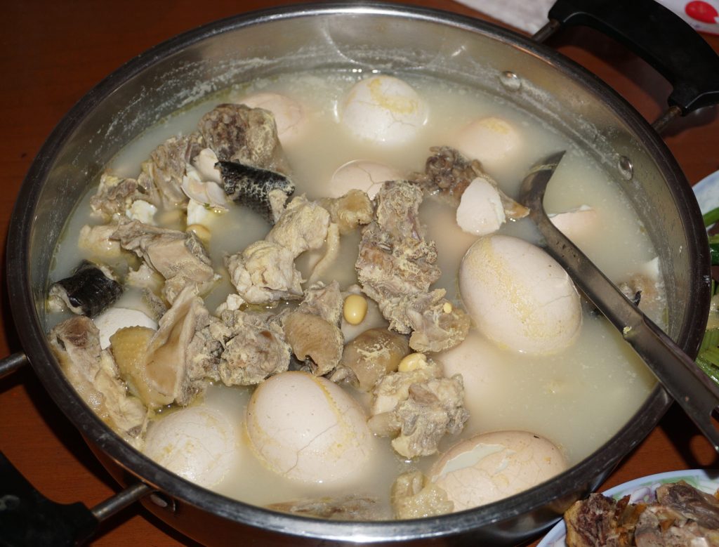 客家人是非常的好客的。也有幸吃到了几种地道的客家食物。腊兔子,还是卤制的。还有糯米饭,里面加了一些干果,甜的,味道很好了。而那一盆汤,这时客家龙凤煲,猜想应该是用来招待贵客的吧。远道而来的都是贵客。龙凤煲,就是蛇、鸡,还有整个的鸡蛋。材料足,味道好。到上村的话,一定要品尝哟。
