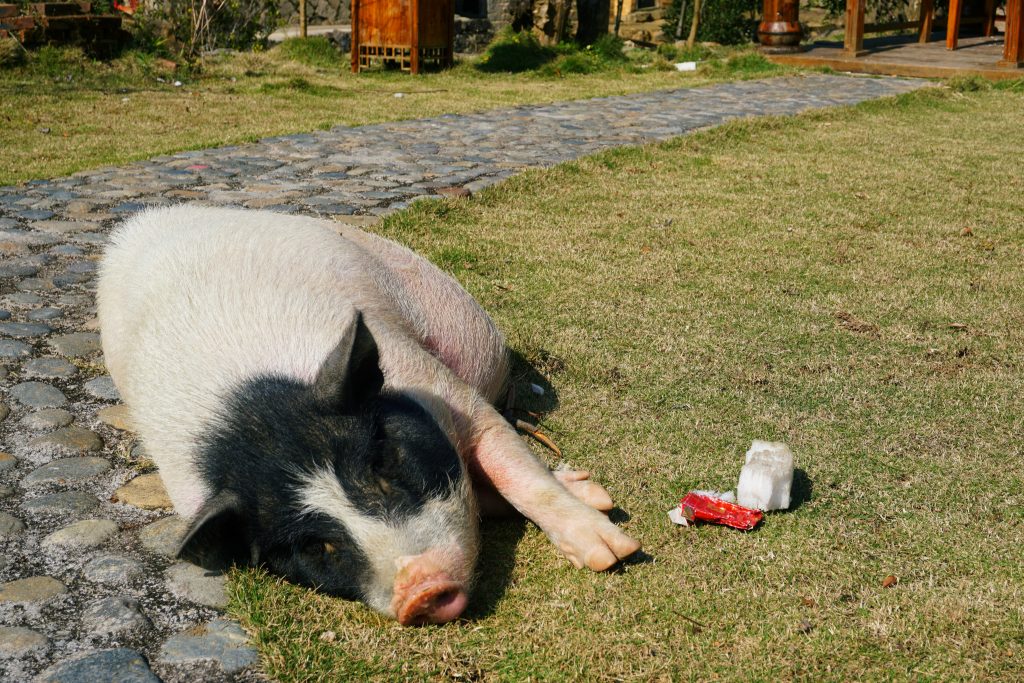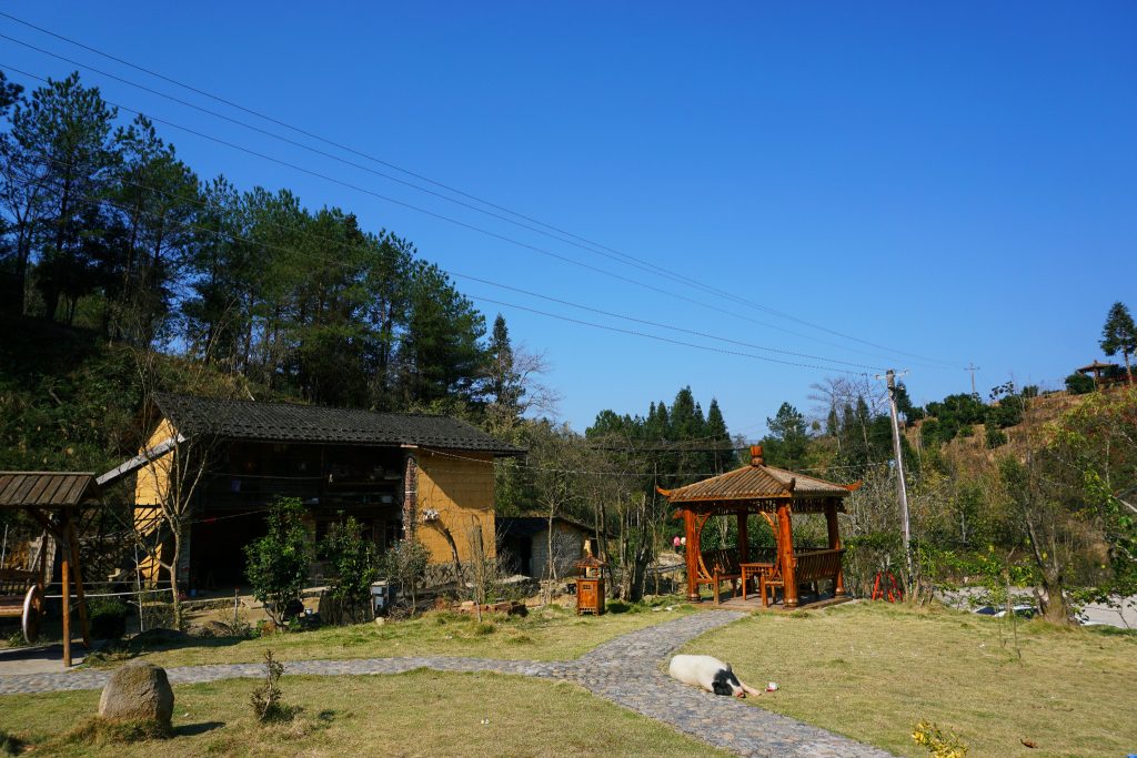 然后,去了一个叫做池牛岗的地方,只有一座圆形的土楼,还有真正的土做的房子。这个池牛,在客家话中的意思就是杀牛的意思。换句话说,以前这里是杀牛的地方。居然在那里,看见了一只猪猪,趴在草坪上晒太阳呢,悠闲自得,无比惬意。