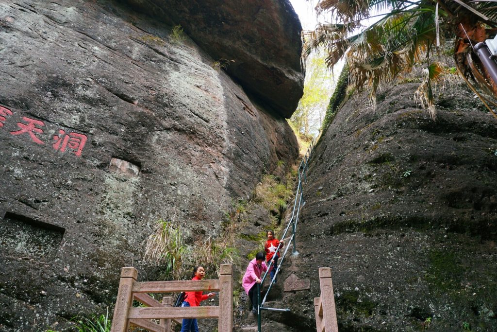 游完 长寿 峰,按照路标的指示,就要前往一线天了。在去一线天的路边,还有两个险峰可以攀登,分别是五老峰和灵芝峰,九十度的坡度,只是窄窄的的台阶,而且台阶之间的跨度很大,只有牢牢的抓着铁栏杆,手脚并用,才能往下爬。