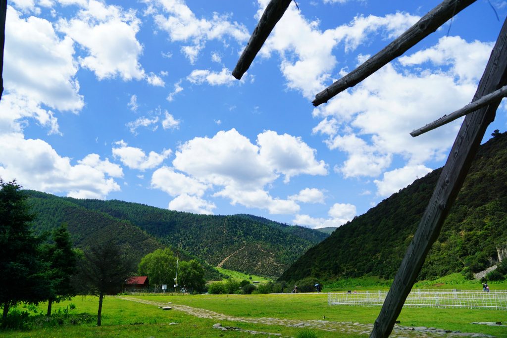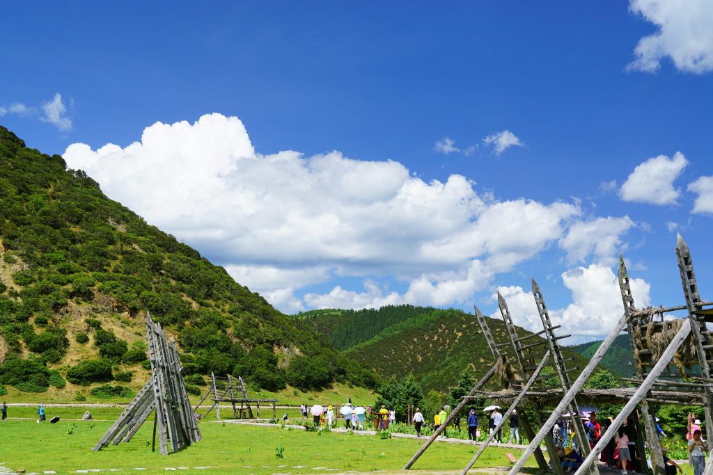 在属都湖的旁边有一个小小的草原。草原上也会有一些木架子。这些木架子在藏区很常见,是用来晒青稞的。