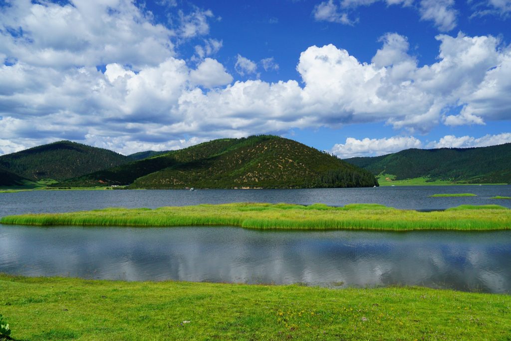 靠边的湖水应该是不深的。湖边全是湿地。湖边也有一些水草形成的小岛。夏天草还是绿的。据说在春天的时候,有很多野花,色彩斑斓,那就会变成另外的一种美景了。