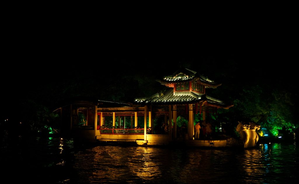 湖边有很多亭台楼阁,有些事当地的居民在里面纳凉、聊天,或者是练练乐器。还有一些,是职业的表演团队在里面表演,每当游船经过的时候,演员就开始表演的了。