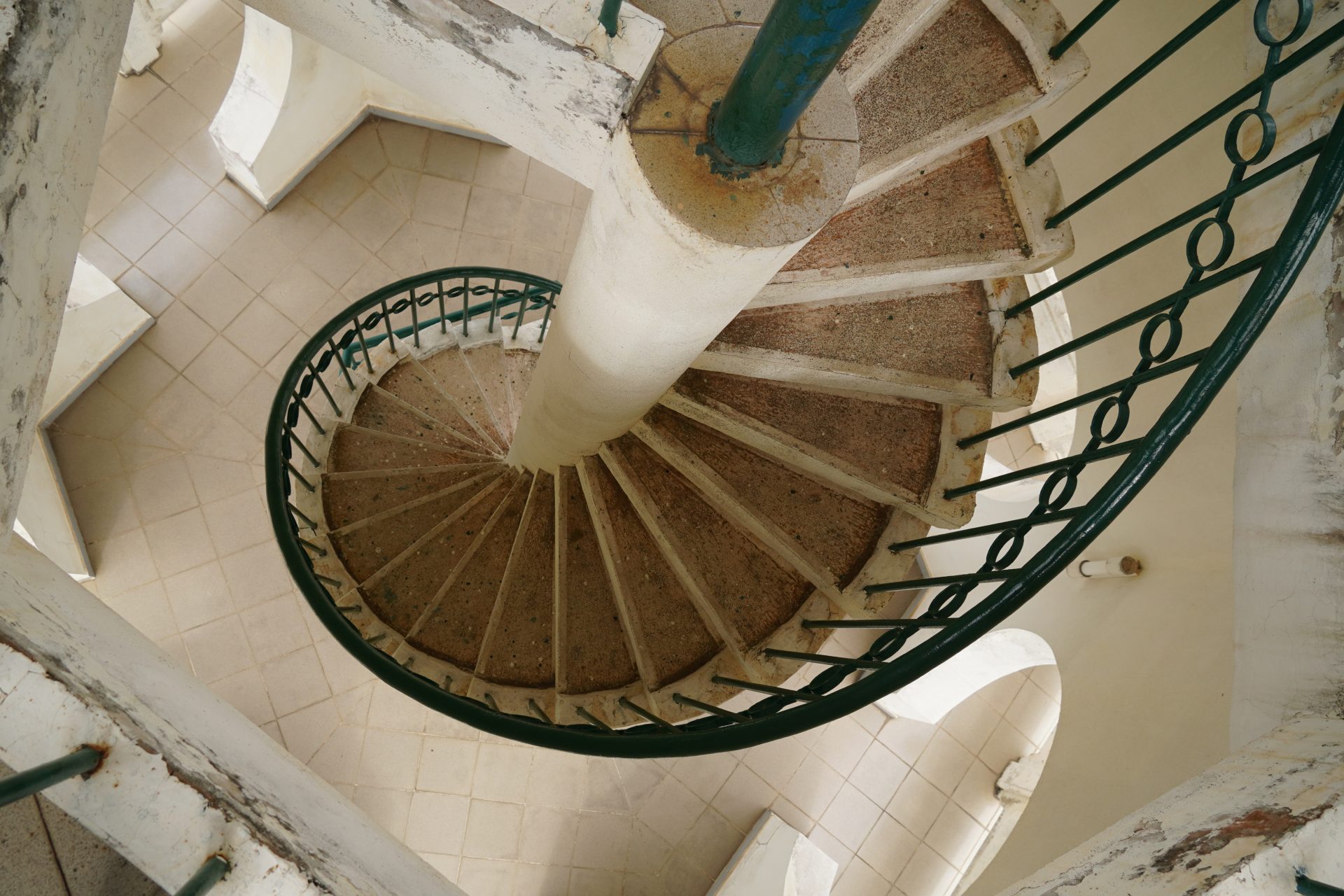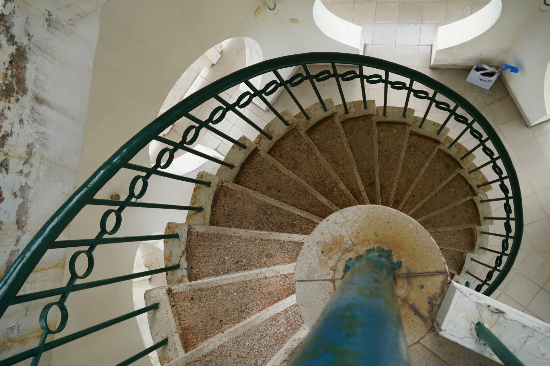 上图是从海中间的半岛上,拍摄岸边的照片。小山顶上的那个三层的楼阁,就是螺旋型楼梯的。