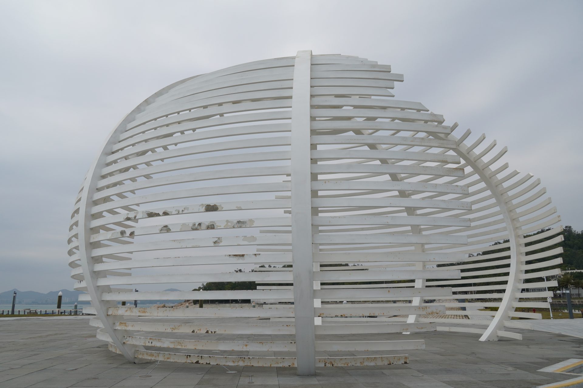 两个弧形,组合在一起,最开始感觉是代表了地球,但联系到这是在海边的,应该是贝壳类海洋生物的象形。