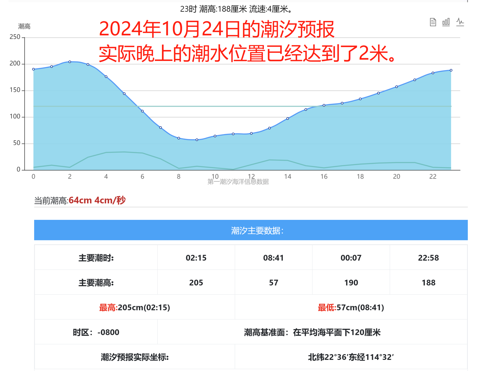 2024年10月24号到核电基地的码头钓鱼,用的饵料是活虾,虽然潮汐预报是小潮,但实际情况当天的潮水是很高的潮位,主要是因为天气情况就是外海有大风,实际上天气预报是台风刚刚生成,外海的大风,推高了潮位,所以说潮汐预报也不是很准确的。